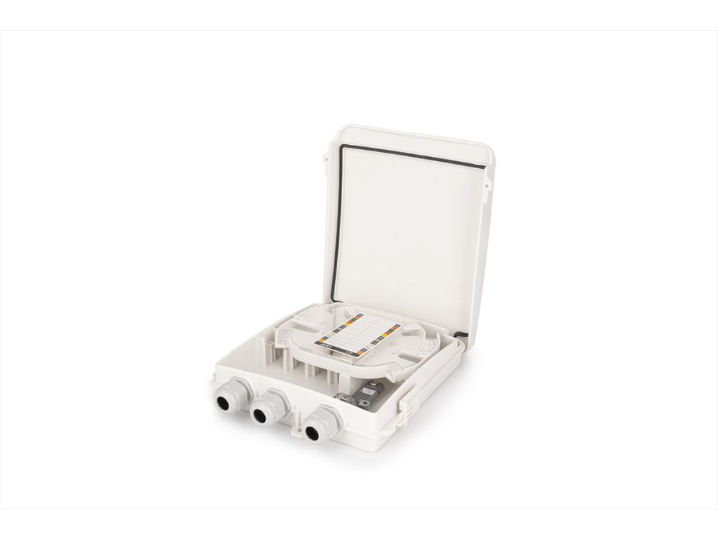 FTTH optický box, IP54, 12 zvarov, pre 4xSC, LCD, držiak. rozdeľovač, 160x200x42mm