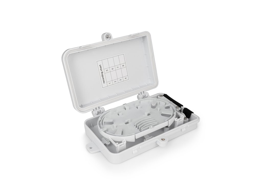 FTTx optický box, IP44, výklopná kazeta 8 zvarov, pre 4xSC, LC, držiak. rozdeľovač, 135x205x38mm