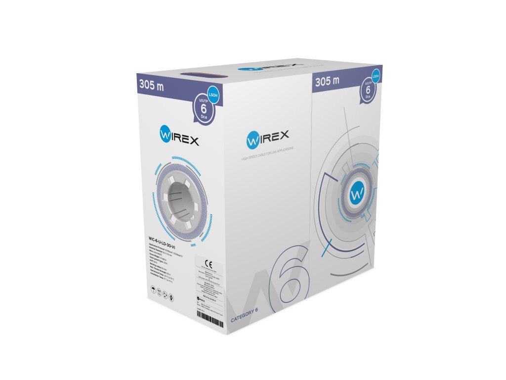 Inštalačné káble WIREX sa vyznačujú vysokou spoľahlivosťou a stabilitou parametrov počas celej životnosti inštalovanej metalickej dátovej siete. Zvládajú najnáročnejšie prenosové protokoly, ktoré možno podľa noriem prevádzkovať na kabeláži CAT6. Tento typ káblov možno inštalovať v rôznych prostrediach, ako sú kancelárske priestory alebo dátové centrá. Kábel sa dodáva vo farebnej škatuli, čo umožňuje rýchlo identifikovať, o aký typ kábla ide v inštaláciách, kde sa používa viacero typov káblov. Pre prehľadnosť je metráž kábla označená od 0 m do 305 m.