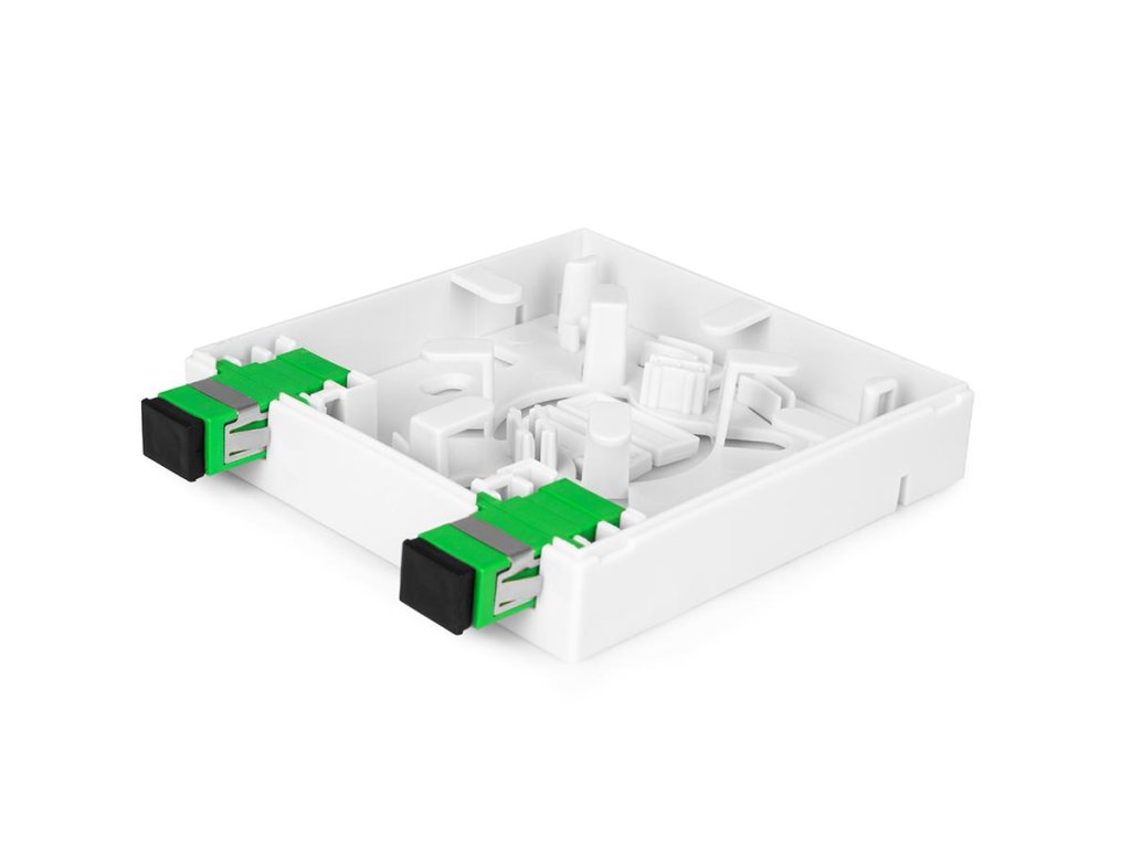 Nízka, kompaktná, estetická optická zásuvka.Optická zásuvka navrhnutá špeciálne pre aplikácie FTTH - Biela farba - Držiak vstupného kábla - Zaslepovacie zátky pre nepoužívaný port - Rozmery 86 x 86 x 24 mm - Pre 2 x SC, LC duplexný konektor - Nárazový kryt, nie je potrebné skrutkovať